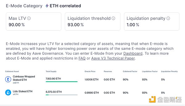 既然 LSD 这么好赚,借贷协议也针对 LSD 有优化政策对待,比如 AAVE V3 Emode,如果你仅借 ETH 的话,那么 stETH 的抵押率 LTV 高达 90%, Comp V3 针对 stETH/cbETH 也是类似条款。这种条款下 1ETH 最后可以变成 10stETH,快速帮 stETH 扩大规模。对于折价买入 stETH 的套利者来说,其也可以利用此 10倍扩大套利收益。