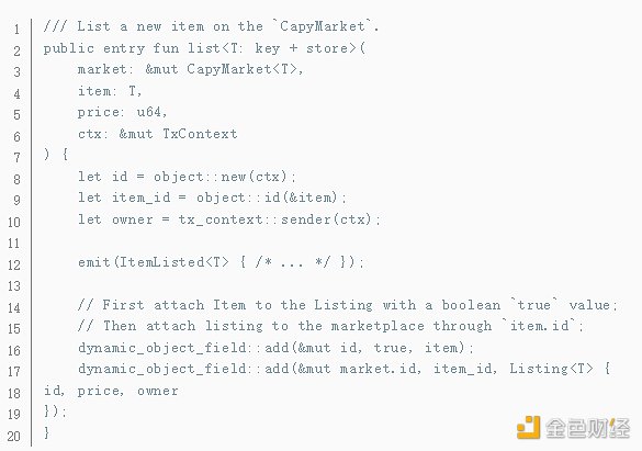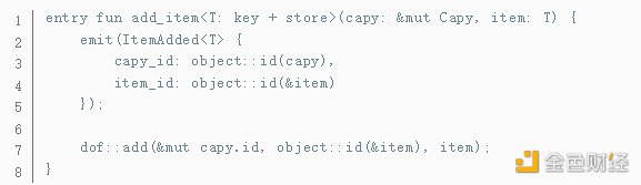 在Capys中添加和删除附件时,使用了动态对象字段,这是一种更有效、更方便的替代Sui中父子对象的方法。动态字段允许任意的名称,并且可以即时添加和删除。下面的代码将一个项目添加到一个Capy中。