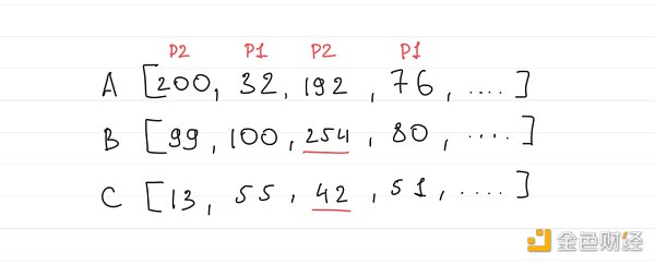 使用散列函数(sha3_256)三次加盐生成三个32字节的向量(标记为A、B和C),这些向量来自capy_hash。