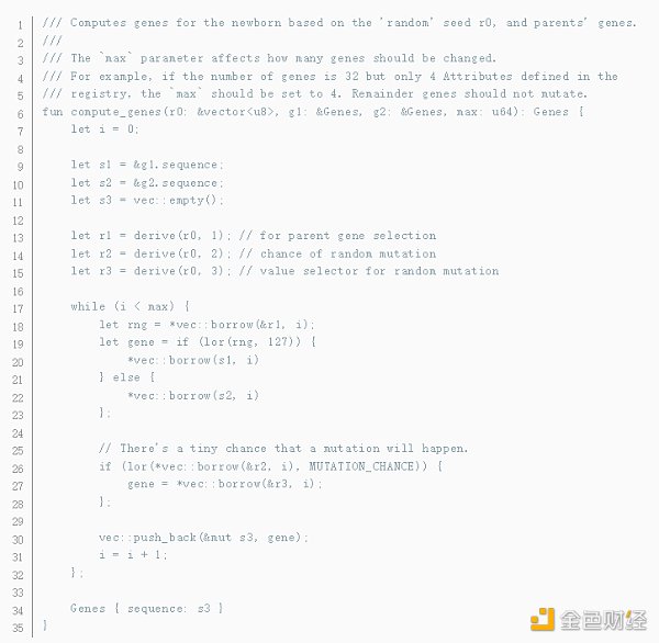 genes属性存储了基因序列,这是一个32字节的向量,用于计算属性和在育种期间为新生儿选择基因。