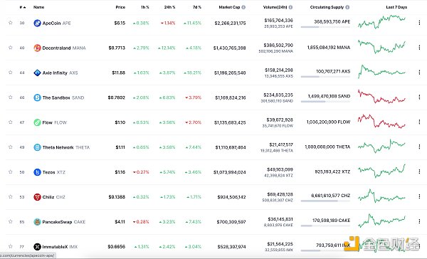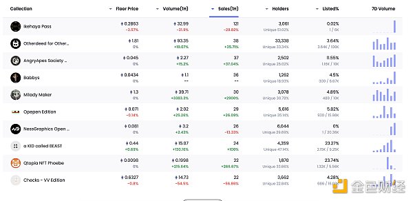 24小时NFT交易量、交易量前十项目 数据来源:Coinmarketcap
