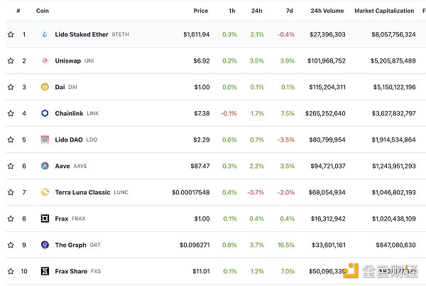DeFi总市值及前十代币 数据来源:coingecko