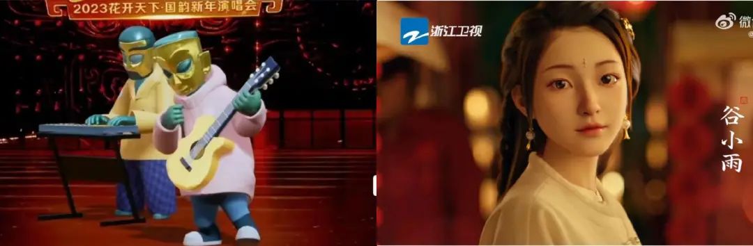 图/四川卫视“三星堆摇滚天团”虚拟乐队(左) 浙江卫视首位宋韵数字人“谷小雨” (右) 来源/燃次元截图