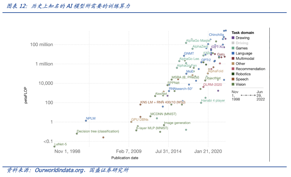 AIGC未来应用普及的背后,将产生巨大的算力市场。根据OpenAI的研究,AI训练所需算力指数增长,且增长速度超越硬件的摩尔定律。AI模型大算力的背后需要高昂的算力成本,GPT-3训练的算力成本超过400万美元。尽管AI模型往往会选择开源,但数据集和训练成果是一个团队的内部资产,这意味着每个AI产品都需要支付自己的训练成本。在未来AIGC随着B端和C端的商业化落地的实现,算力集群的建设和云服务都会受益,同时考虑到英伟达A100、H100出口受限,相关国产算力芯片将有机会获得增量市场。