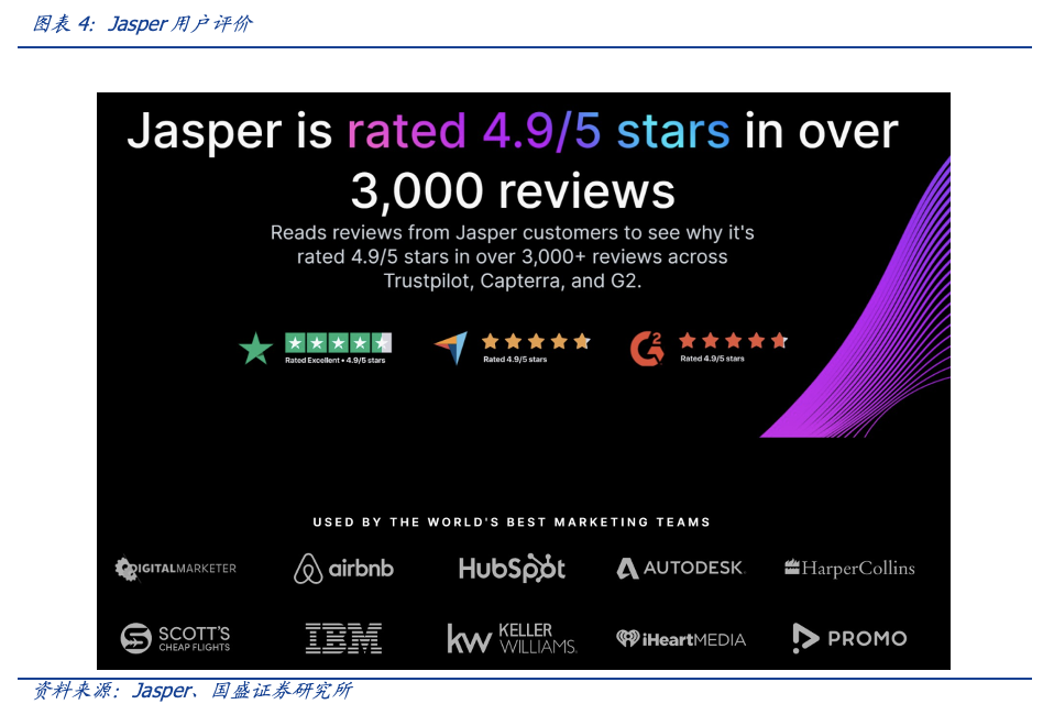 AIGC带来的商业模式变革——AI的显性化。随着自然语言技术(NLP)进一步降低AI的使用和触达门槛,以及伴随着AIGC生成算法的优化与改进,我们发现AIGC的商业化落地速度和效果表现将超预期,一些如Jasper这样的初创企业已经开始产生了营收。这意味着AI正以越来越显性的方式产生商业模式。AI已经不再像过去那样与硬件、系统等一起打包进行商业化落地了。对于普通人来说也不再是一门遥不可及的尖端技术。