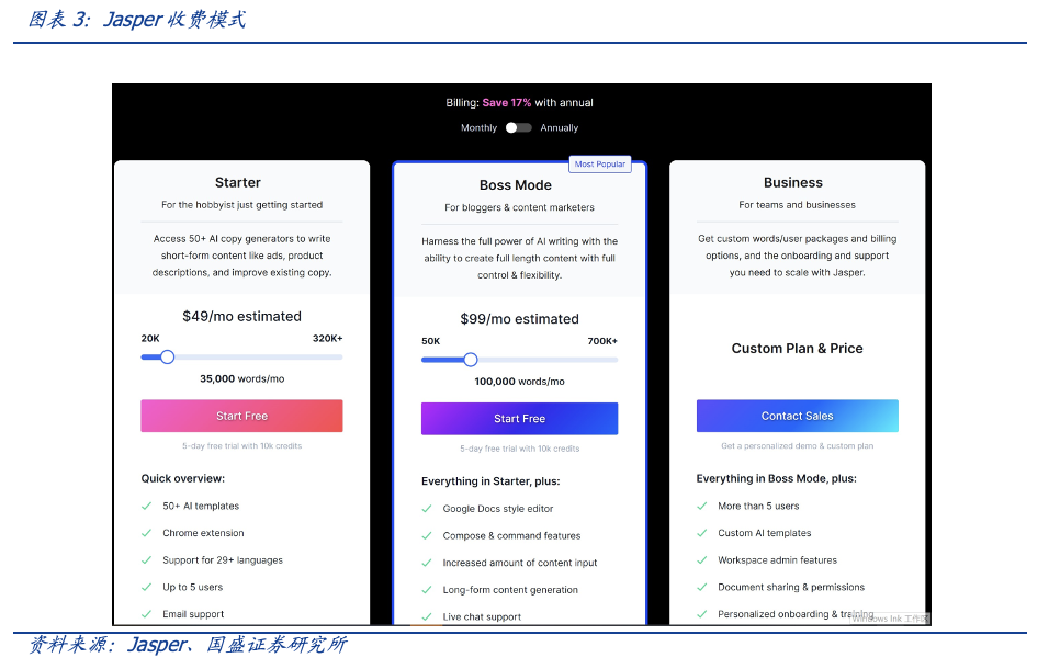 而随着自然语言技术(NLP)进一步降低AI的使用和触达门槛,以及伴随着AIGC生成算法的优化与改进,我们发现AIGC的商业化落地速度和效果表现都很好,一些如Jasper这样的初创企业已经开始产生了营收。这意味着AI正以越来越显性的方式产生商业模式。以成立于2021年的Jasper为例,其成立当年营收就达到了4500万美元,并收获了7万名用户,2022年营收也预计7500万美元。从Jasper的官网上看到,它是以类SAAS服务的形式进行收费,分为初级、高级和订制三个模式。而国内部分领先的AIGC公司,在用户规模、内容生成量上在2022年亦快速起步,预计2023年开始产生营收及盈利并非难事,但能否形成SaaS订阅模式尚待观察。