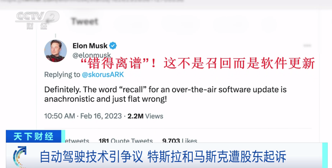 特斯拉股价当天下跌5.7%。特斯拉当时回应称,美国国家公路交通安全管理局“错得离谱”,称这不是召回而是软件更新。
