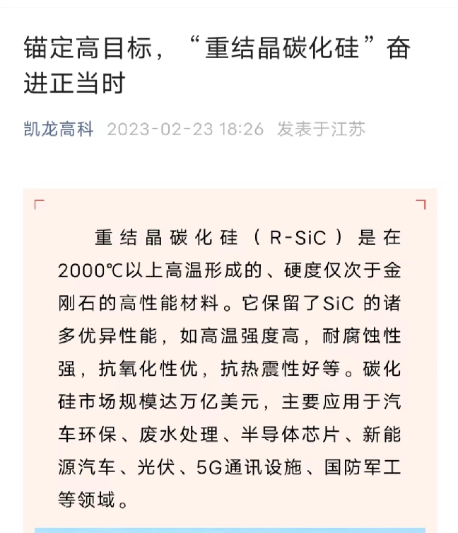 近期,除了上述“重结晶碳化硅”消息外,凯龙科技还通过微信公众号等渠道释放出诸多利好。