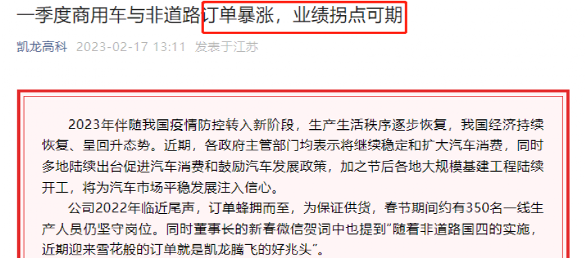 如2月17日,公司在官微发文《一季度商用车与非道路订单暴涨,业绩拐点可期》。文章称,“公司2022年临近尾声,订单蜂拥而至,为保证供货,春节期间约有350名一线生产人员仍坚守岗位。同时董事长的新春微信贺词中也提到”随着非道路国四的实施,近期迎来雪花般的订单就是凯龙腾飞的好兆头。