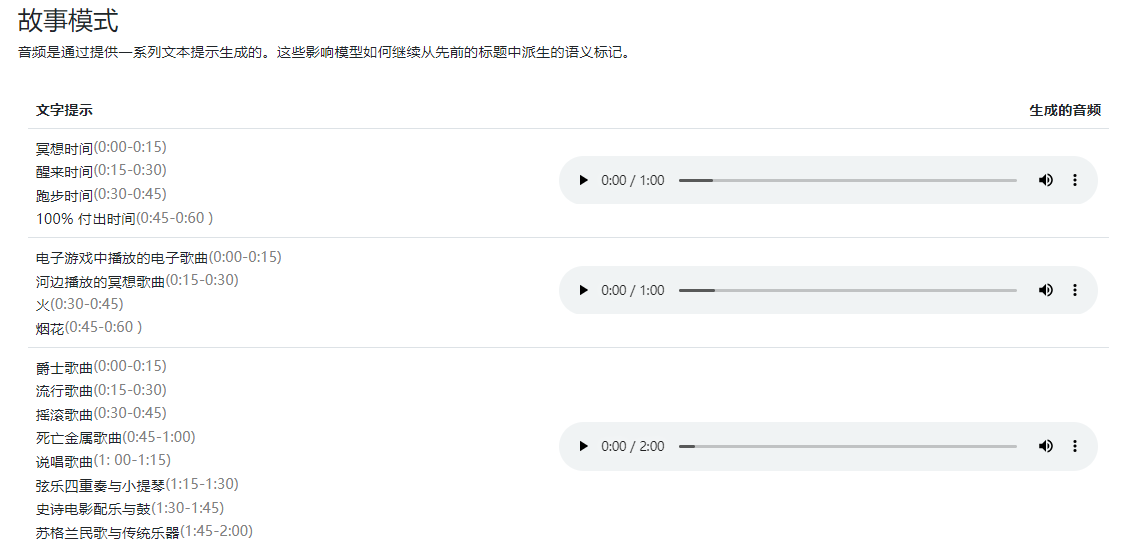 MusicLM甚至来个音乐串烧,在故事模式下将不同风格的曲子混杂在一起。即便要求生成5分钟时长的音乐,MusicLM也不在话下。