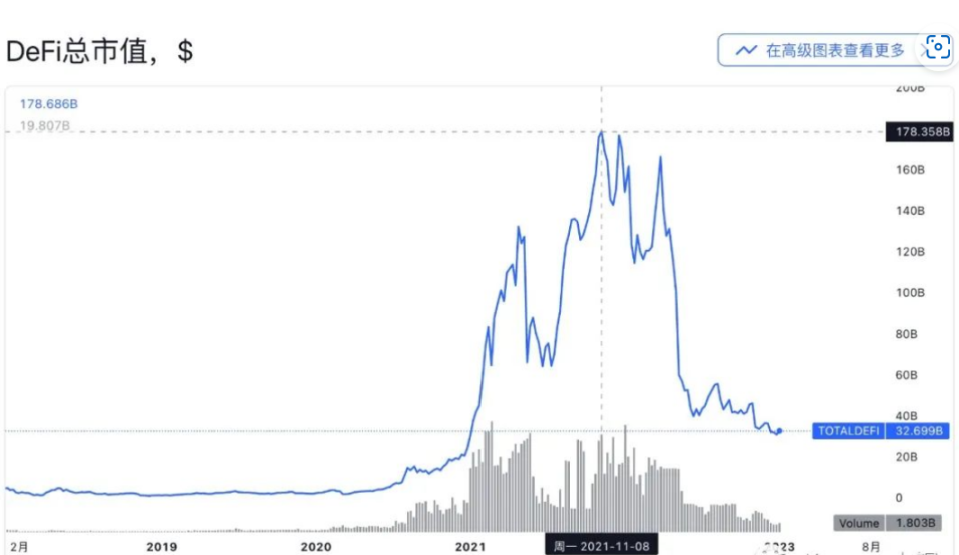 DeFi 即去中心化金融,崛起于 2020 年夏天,因此那段时间也被称为 DeFi Summer。根据 TradingView 的统计数据,2020 年夏天刚崛起时,DeFi 总市值仅 50 亿美元,随后一路飙升,在 2021 年底达到了最高峰,将近 1800 亿美元。
