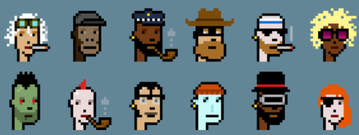 第一个真正意义上的 NFT 项目叫 CryptoPunks,于 2017 年 6 月发布,由 10,000 个 24x24 像素的头像所组成。每个头像都是由算法生成的,独一无二且所有头像都上传到了以太坊上,也是目前为止唯一一个将所有头像数据全部上链的 NFT 项目。下图为 CryptoPunks 官网展示的部分头像: