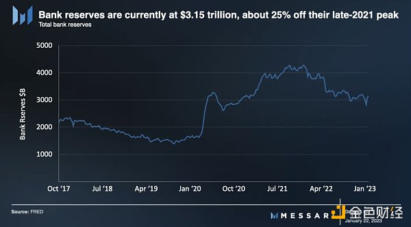 在 11 月底美联储主席杰罗姆·鲍威尔 (Jerome Powell) 向布鲁金斯学会 (Brookings Institution) 发表的讲话中,他为 QT 激进的步伐辩护,称银行处于“充裕的准备金制度”中。这意味着,至少在理论上,银行应该能够购买美国国债,而不会将其储备消耗到美联储的舒适水平(约 2.5 万亿美元)以下。