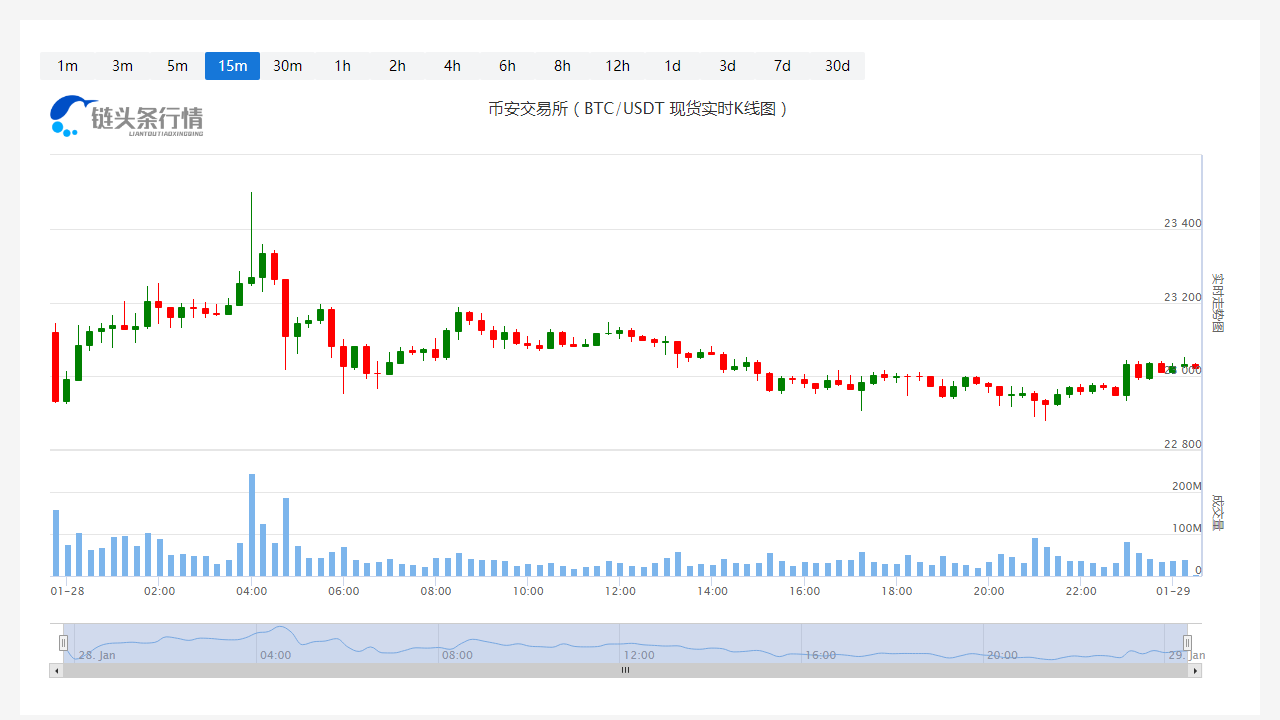 比特币(Bitcoin) 在过去 24 小时内下跌了 -$64.67美元,下跌比为 -%0.28。