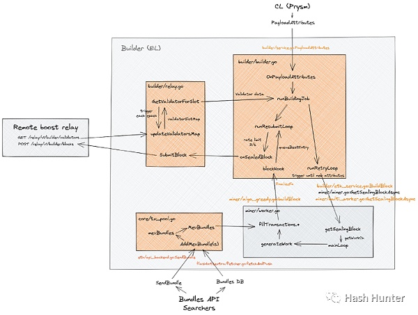 区块构建者(block builder):得益于flashbots在2022年11月份将区块构建的架构开源,我们可以知道区块构建者内部的架构设计。一个完整的区块构建客户端由两个不同的节点组成,包含了一个区块构建规格的geth执行层节点程序,以及一个改动过的prysm共识层节点。