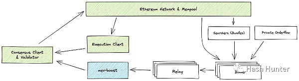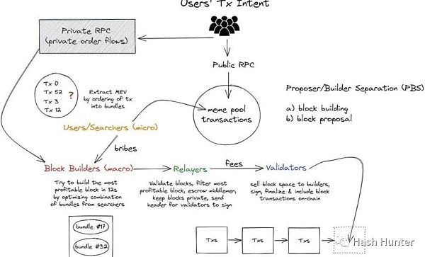 当一个用户发起一笔交易时,首先会进入公共内存池,如果这是一笔普通的交易,那就会在等待一段时间之后被区块构建者放入其创造的区块中、如果这是一笔被搜索者盯上的交易,就会以捆绑包的形式进入区块中。再经过中继层、最终被区块提议者签署证明并将其广播到网络。用户也可以使用区块构建者的私人节点,从而避开公共内存池。