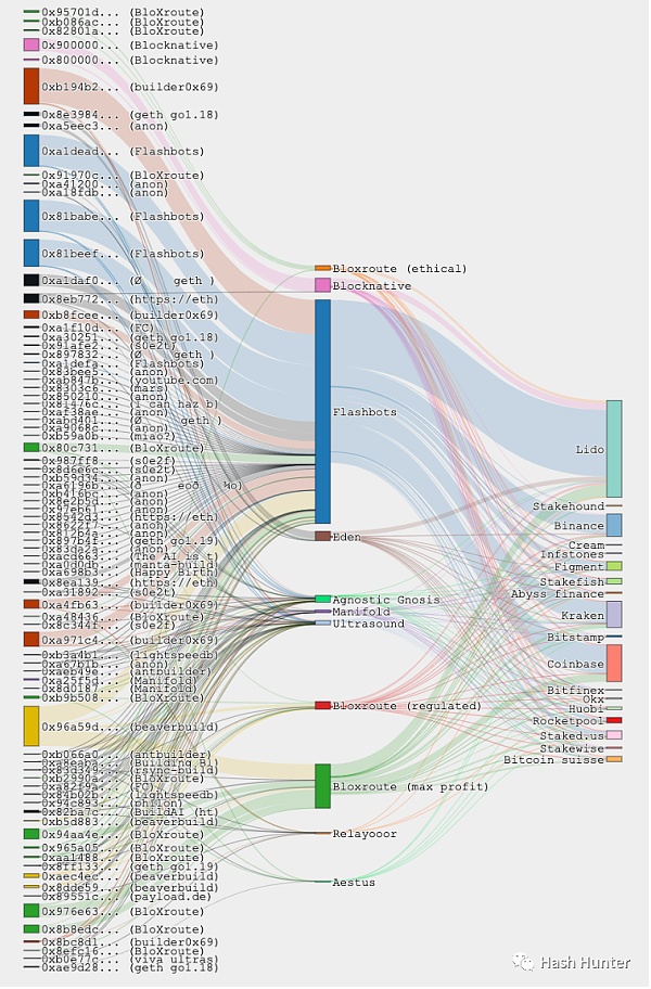 例如:BloXroute、manifold、blocknative、beaverbuild、0x69、edennetwork、lightspeed、eth-builder等。上图最左侧的为构建者的区块占有量,中间为中继层占有量、右边为验证人占有量,flashbots并不是最大的区块构建者,确是当前最大的中继服务商。笔者在22年12月份统计了从合并以来的60万个区块数据。