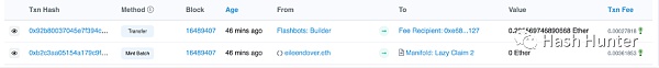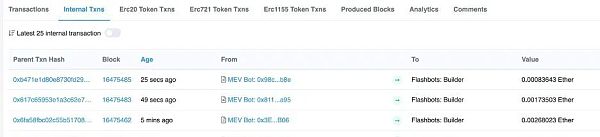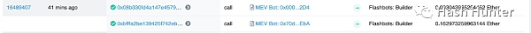 我们以16489407区块为例,从ethscan上显示他整体的区块奖励为0.129830707718222266 Ether,这并不是他实际的区块构建利润,仅仅只是交易费用-销毁的gas费用。从flashbots的地址中可以查询到coinbase.transfer的记录,可以看到搜索者给其支付了两笔笔合计0.16601722521 ether的手续费。当然这个区块实际上存在6个捆绑包,只不过剩下的4个捆绑包是以gas费的形式来支付的。篇幅有限笔者在这里不详细赘述,未来会开一篇文章详细介绍如何计算一个区块的mev收益。