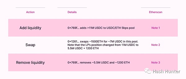 Jit 机器人(just in time):这种模式出现在uniswap v3的代币池子中,因为v3本身的集中流动性特性,使得用户可以在某个极小的区间内设置一笔lp。当一个用户想要在v3进行大量代币交易时,立刻发起一笔添加流动性的交易和一笔销毁流动性的交易。将用户的交易夹在其中,从而获取这一笔交易产生的流动性收入。这种模式需要jit机器人提前计算好前后交易的头寸变化,使得用户的交易刚好落在其设计的流动性区间内。