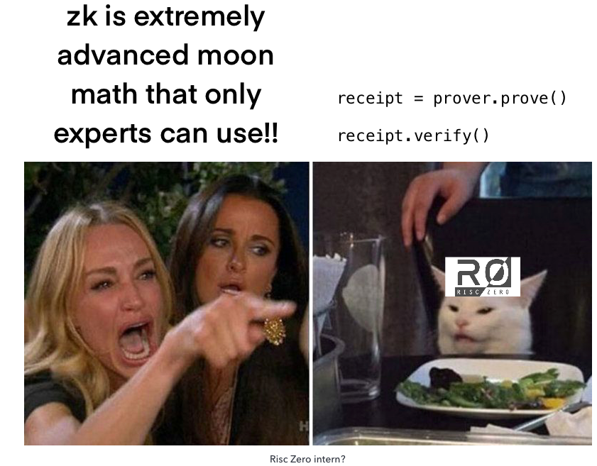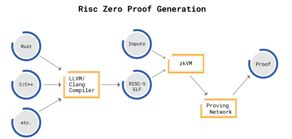 对于RISC Zero,开发者编写Rust或C (最终是任何针对RISC-V的东西)。然后,系统接受编译过程中产生的ELF文件,并将其作为虚拟机电路的输入代码。开发者只需调用证明,返回一个收据(包含执行跟踪的zk证明)对象,任何人都可以从任何地方调用`验证'。从开发者的角度来看,没有必要了解zk是如何工作的,底层系统处理所有这些复杂的问题。