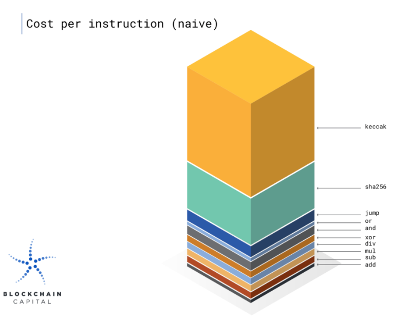 这个类比对于生成zk证明的效率来说相当适用。正如前面所讨论的,在证明zk的执行轨迹时,你要为轨迹中每一项的所有指令的成本之和买单,所以更简单、更少的总指令是更好的。