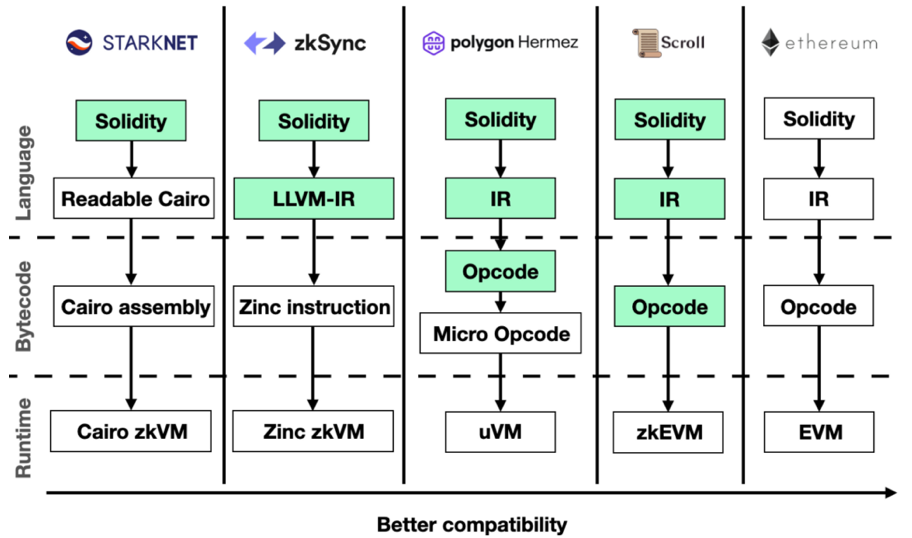 所有这些方法之间的主要技术区别在于,在语言栈中,计算究竟在哪里被转换为可以在证明系统中使用的形式(算术化)。在一些zkEVM中,这发生在高级语言中(Solidity、Vyper、Yul),而其他方法则试图将EVM一直证明到操作码级别。这些方法之间的权衡在Vitalik的帖子里有深刻的论述,但我将用一句话来概括它。在堆栈中发生的转换/算术化越低,性能损失就越大。