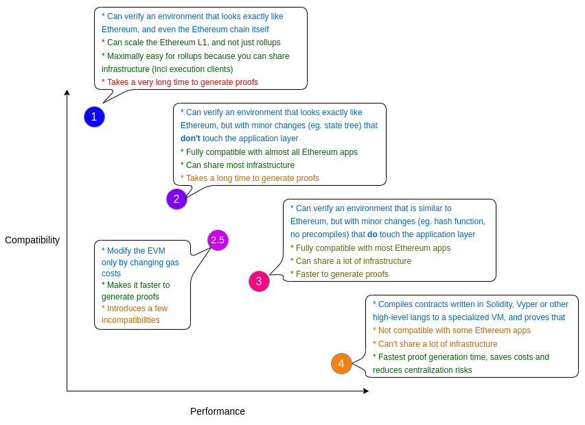 去年夏天,Vitalik 写了一篇博文,概述了不同类型的 zkEVM(零知识以太坊虚拟机)。Vitalik 根据性能和兼容性来定义与权衡。