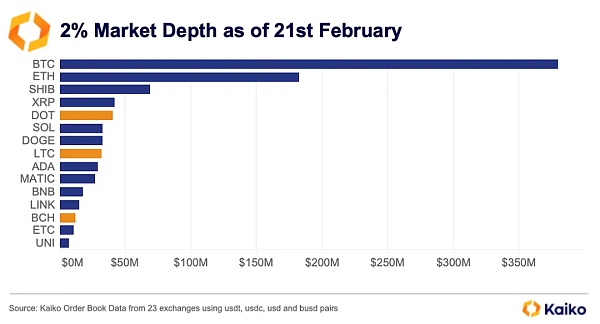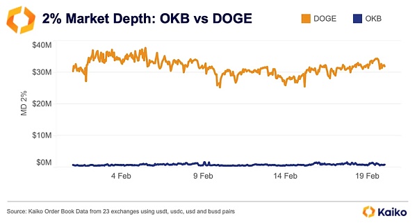 最近,由于okB流通供应量的更新,使其从6000万增加到大约2.5亿,这使其市值增加了逾90亿美元,进入到了 CoinGecko和其他排名网站的前10位,如果一个大盘股指数是基于市值构建的,那么它现在也有资格,如果流动性指标来看,okB的市场深度远不及DOGE,okB的市场深度不到100万美元(订单簿下2%价格深度)变化,而DOGE的市场深度为3200万美元,所以我认为DOGE比BCH和okB更值得考虑。