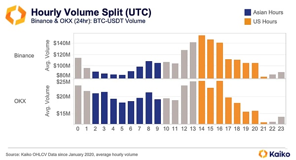 一方面,尽管 okX 总部位于塞舌尔,但我仍将其视为亚洲交易所,因为它无法为美国客户提供服务,而且大部分交易量都是在亚洲时段进行的。我们可以看到 Binance 的交易量明显更偏向于美国交易时段,其中一些交易量最低的时段恰恰是在亚洲交易时段。不过,其实美国人不能使用 Binance,只能使用 Binance.US,因此,尽管交易量偏向于美国交易时段,但它很可能不是来自国内,而是来自某些离岸实体。