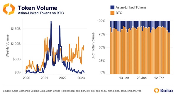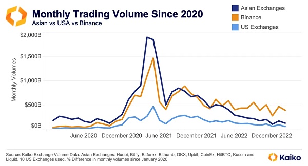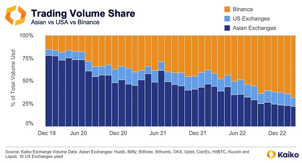 截至 2023 年 2 月,币安在所有交易量中的市场份额已从 2020 年 1 月的 15% 上升至 68%,而面向亚洲交易所的市场份额则相反,同一时间内,从交易量的 78% 下降至仅 22%。