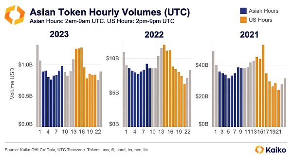 BTC 的每小时交易量可以揭示亚洲主导的叙事还为时尚早。我们知道,过去山寨币交易在该地区很受欢迎,尤其是韩国投资者,话虽如此,但我们需要一个更加广泛的代币和交易动态指标来进行评判。首先使用与亚洲项目挂钩的一篮子指标,下图我们可以看到,尽管亚洲和美国交易时段的总体差异较小,但过去三年间,大部分的交易量仍发生在美国交易时段,到目前为止,2023年的交易量没有显示出新的趋势。(我们将总部位于亚洲或主要用户位于亚洲的项目代币整合为这一篮子指标,例如 Axie Infinity)