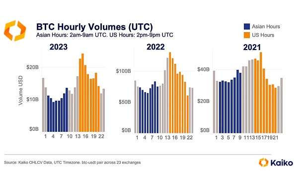在这种叙事的助推下,与亚洲地区相关的代币大幅反弹,有人将其描述为加密市场的下一个催化剂,然而,从市场数据来看,这些说法似乎还为时过早。当我们查看今年BTC的交易量时,会发现,交易活跃时间往往发生在美国交易时区,这表明目前加密市场依旧由西方主导。有值得一提的是,这种趋势在2021年没有很明显,直到这年年底宣布加密禁令之后,趋势开始出现。