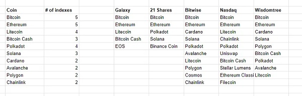 根据香港证监会的提议,他们将只允许交易“包含在两个已批准指数中大市值虚拟资产”。具体会选择哪些代币将由香港证监会决定,其中,其暗示了两种潜在的主流代币。更具一些最大的加密货币指数,@tier10k 列出了相关的代币与权重。