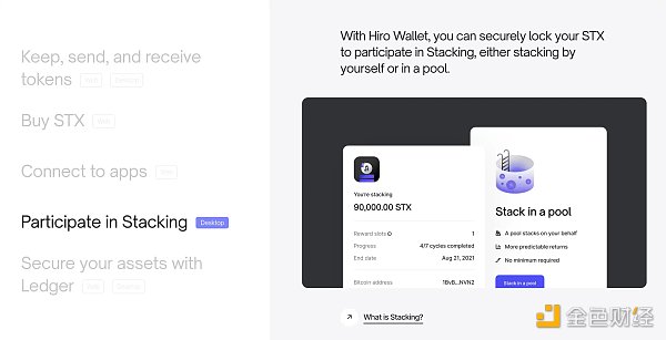 值得注意的是,Hiro Wallet 作为比特币生态钱包,拥有很多较为方便的内置功能,用户可以在 Hiro Wallet 内直接使用信用卡、借记卡甚至银行转账购买 STX,然后在钱包内直接参与质押。