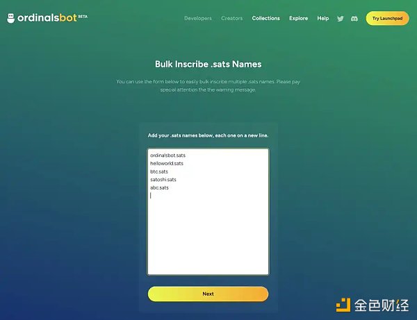 此外,近期刚刚推出新的批量 .sats 名称题词工具: https://ordinalsbot.com/sats-names 只需每行添加一个名称,Ordinals Bot 就会为它们添加必要的属性。