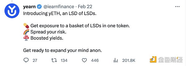 今年 2 月 22 日,Yearn 官方宣布,即将推出新的产品「yETH」,旨在以 yETH 的代币形式覆盖一篮子 LSD 资产,在分散风险的同时提升收益率。