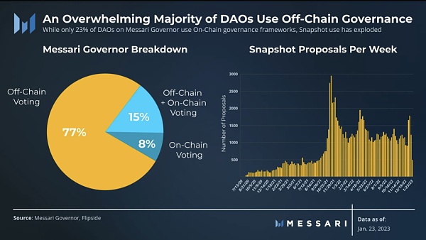 由于这些原因,DAO治理严重倾向于混合治理,它放弃了链上执行,转而使用 Snapshot等链下信号工具。这些DAO验证链的状态以赋予投票权。一旦达成共识,他们通常依靠受信任的社区成员使用多重签名手动执行这些决策,从而引入单点操作故障和潜在的安全风险。