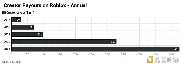 你可能想知道为什么我们在一个陌生的游戏中如此关心版权和支付问题,这是因为这些虚拟世界在未来就是创作者的工作场所。仅在 2021 年,Roblox 就向平台上的创作者支付了超过 5 亿美金。与 OnlyFans 同年向其平台上的创作者支付的 16 亿美元相差甚远。但这表明,开发、培育和维护游戏体验可能是未来的一种就业形式。
