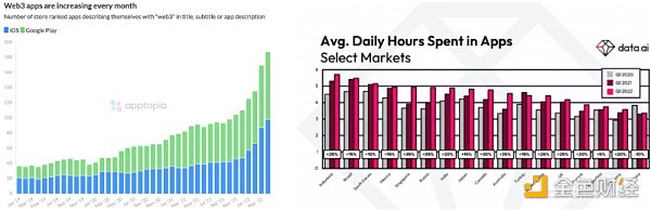 图 3:Web3应用数量增长及主要地区用户在移动应用上投入的时间。数据来源:data.ai , apptopia