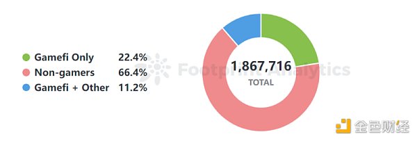 我们调研了市面上 315 款具有 NFT 资产交易功能的 Web3 游戏,发现其中几乎半数项目的核心交易都场景发生在 Opensea 中。根据 Footprint 的数据,所有在 Opensea 进行过交易的地址中,66% 的地址此前从没交易过游戏类协议的资产,仅有22%可被定义为游戏玩家,此外还有 11% 的用户不只交易游戏类资产,还包括 Defi、头像类 NFT 等其他类别。