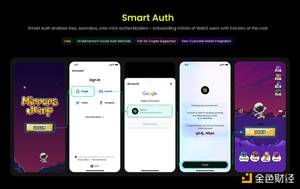 因此,Smart Auth 提供了与这些传统登录方式的便捷集成功能,使用户在登录环节可以直接使用 Web2 的方式进行身份认证,体验上类似目前 APP 的“第三方登录”,无需跳出应用或理解钱包账户的概念。