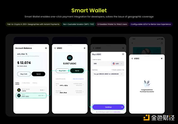 具体实现上,Smart Wallet 采用了目前前沿的 MPC 方案,免去私钥保存和管理的问题;同时也集成了法币的入金方案,使得用户在当地法规允许的情况下,直接在应用中进行加密资产的购买。