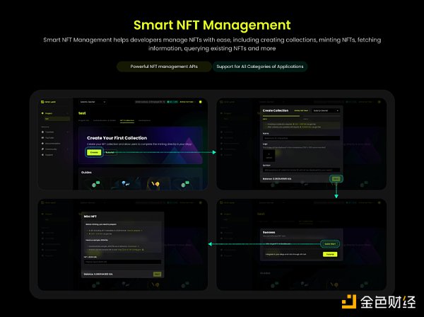 一个完整的 NFT 交易市场,不光能承载二级市场的交易,也应该满足一级市场的 NFT 发售需求。因此,Smart NFT Management 的作用在于,帮助项目方进行 NFT Collection 创建、NFT Minting、Fetching / Querying 等各类 NFT Apis 的调用,并能够集成在各种不同类型的应用中。