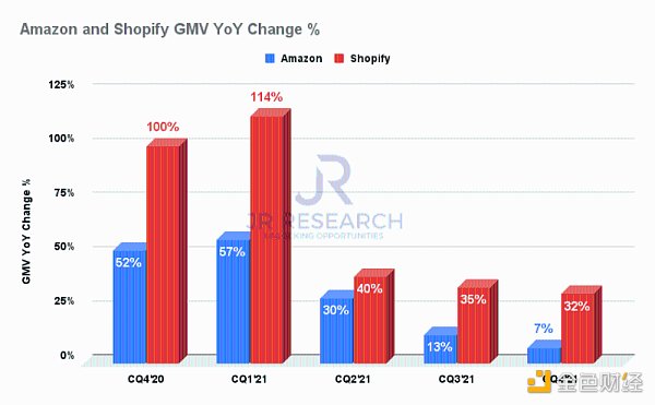 图 5:亚马逊和 Shopify 的 GMV季度同比增长率。数据来源:JR Research