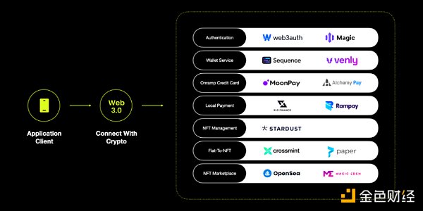一个应用想要完整的接入Web3,不光是自建应用市场的构建,还涉及到账户认证、钱包服务、出入金、和相关 NFT 配套管理等多个环节,而其中的每一个环节都有不同的供应商来提供技术服务,他们也有着不同的技术口径、标准和对接的节奏。