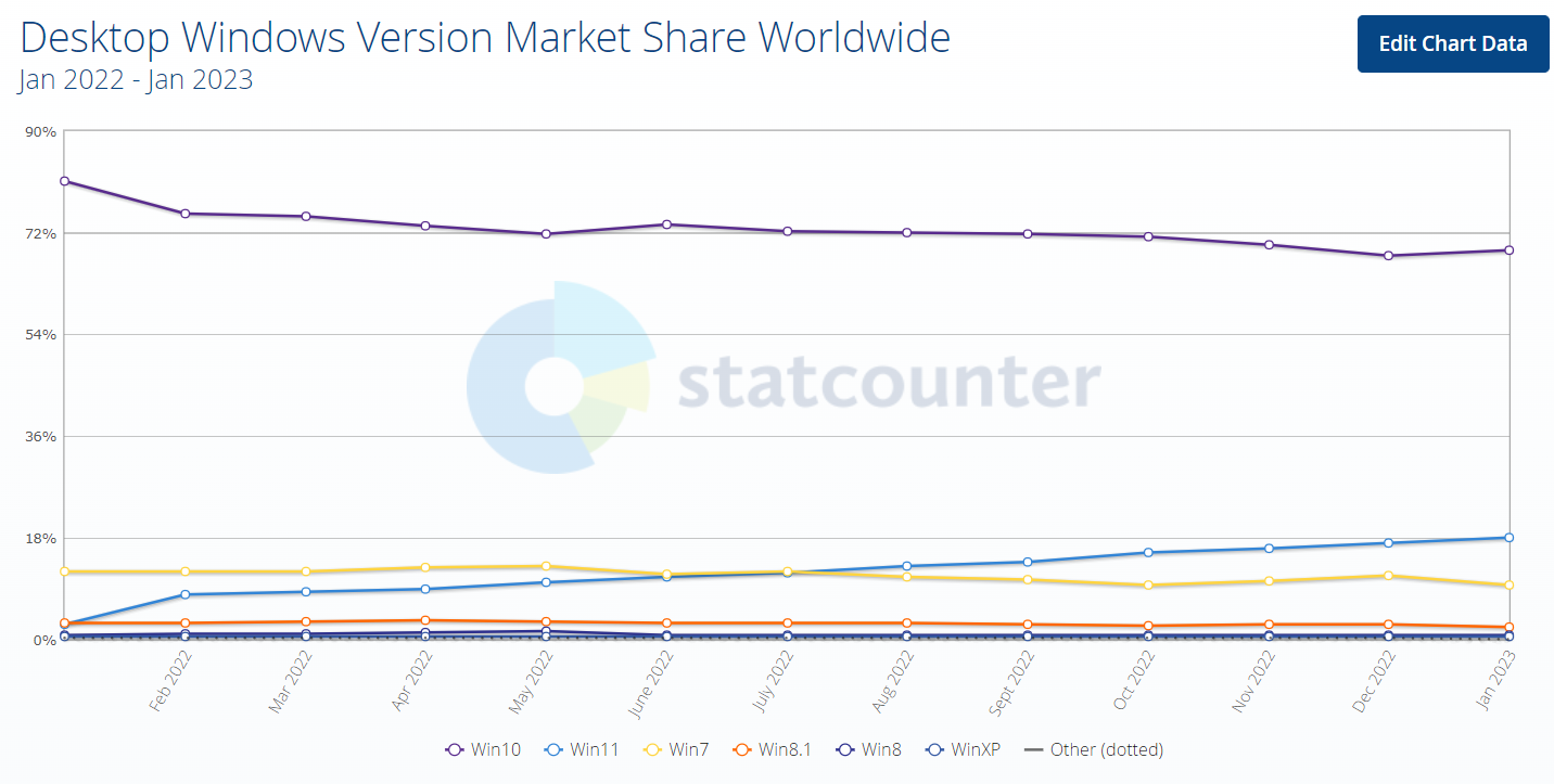 从种种数据来看,微软的这项更新,对于搜索引擎市场也不会产生立竿见影的冲击。除了新必应的使用人数限制外,Windows 11系统的用户数量也是另一层限制。虽然微软已经确认将在2025年停止对Windows 10的支持,但根据StatCounter的数据,截至今年1月Windows 10用户的占比仍接近7成,系统的稳定性依然是用户不愿升级的主要担忧。