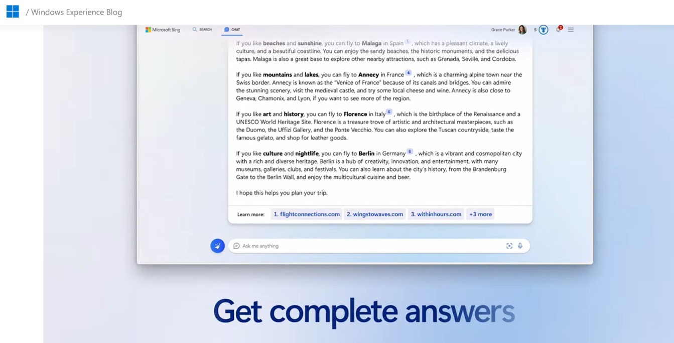 从功能上来看,用户可以在搜索框里直接提问,并通过点击新必应按钮呼出独立的对话界面。不过从展示界面来看,这项功能并没有集成让必应“写命题小作文”的功能。