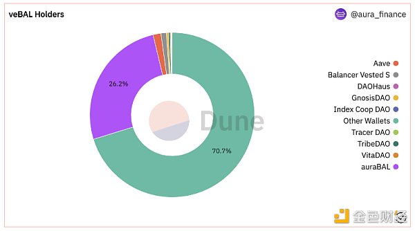 据 Dune 数据显示,Aura 的$veBAL 持有占比为 26.2%,通过$veBAL 的治理贿赂,LP 持有者将获得更高的收益率。而 Balancer 流动性治理战争的优势在于其比 Convex 更高的贿赂资本效率,最终 Aura 也将因此受益。