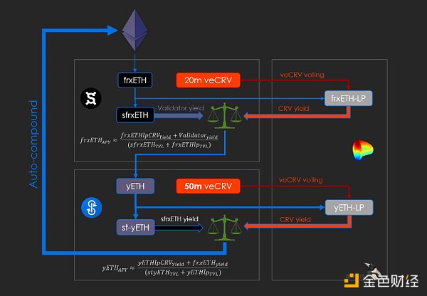 其实从图中模型所示,Yearn 和 Frax Finance 其实不存在直接竞争关系,因为 yETH 的底层支撑资产并非 ETH,而是 stETH 和 frxETH等LSD资产,而 yETH 将会为 stETH 和 frxETH 持有者提供更高的收益,这将推动巨大的以太坊质押飞轮的出现或者说是新的套娃浪潮。