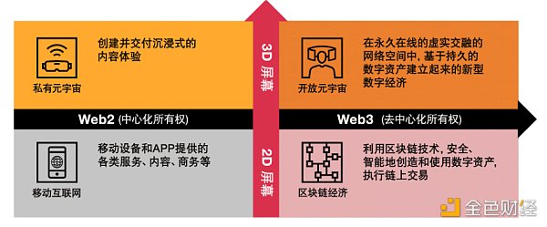 上图可见,它把元宇宙分为“私有”和“开放”两个类型,从简单分类看,私有元宇宙就是当前大众概念里的元宇宙,而开放元宇宙,就是加了Web3,也就是以区块链技术为基座,进而产生的以数字资产为核心的数字经济。